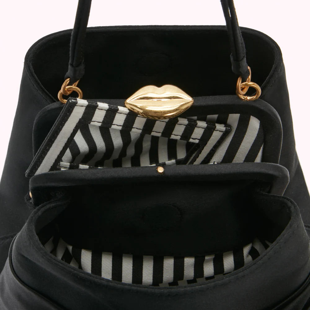 Crafted from Black satin and adorned with a festive bow, our mini Ruby is ladylike but with a punk-ish twist. She’s the elegant, (slightly cooler) sister to Ruby and perfect for that not-to-be-missed occasion. Note the signature lip clasp for that extra dash of vintage-inspired Lulu.