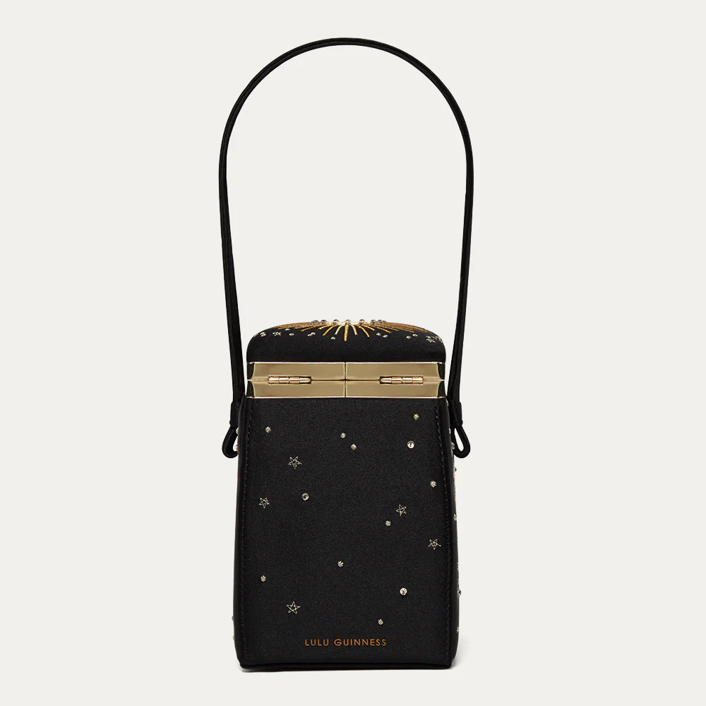 Meet Frame Clutch Halley, your new cosmic occasion bag - designed to dazzle with celestial charm. Crafted from Black satin, this standout piece from our Cosmic Collection features intricate embroidery and appliqué detailing, with a shimmering moon on one side and a radiant sun on the other. Finished with sequin accents, Halley is full of personality and perfect for adding a touch of novelty to any special moment.