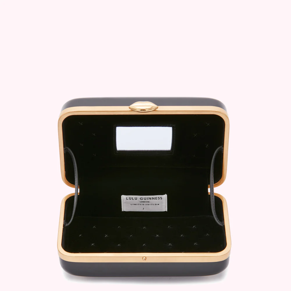 Glossy, polished and with art-deco detailing, Fontaine personifies our mantra: bags to put on the table not on the floor. Named after the unforgettable British actress Joan Fontaine, the Oscar winner was the epitome of old-school glamour, just like this vintage-inspired evening bag. Note the luxe quilted velvet interior with vanity mirror.