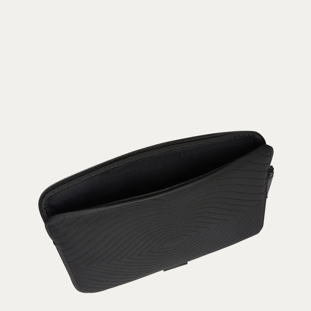 The Lip Ripple Betsy Laptop Case is crafted from recycled nylon in classic black, featuring a bold lip ripple design. With ribbon zip pulls and a protective padded interior, it keeps your tech safe in signature Lulu style.