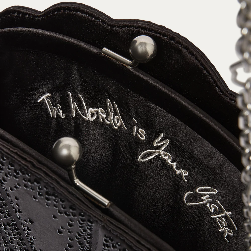 For all you iconic mermaids. The perfect special gift or party bag, we’ve adorned our bestselling Black Satin Shell Clutch Bag with all-over Swarovski® crystals. Note the special Lulu detailing - like the diamanté initials, frame clasp closure and giant pearl hidden inside, just for you. Keep it forevermore in your collection and love it!