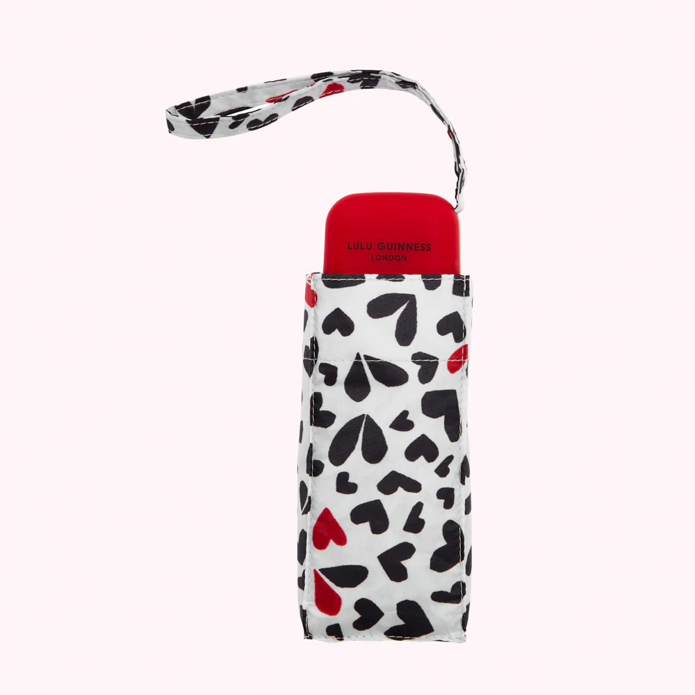 Pale grey and chalk cut out hearts printed umbrella featuring a wrist strap, protective case and lightweight, compact design.