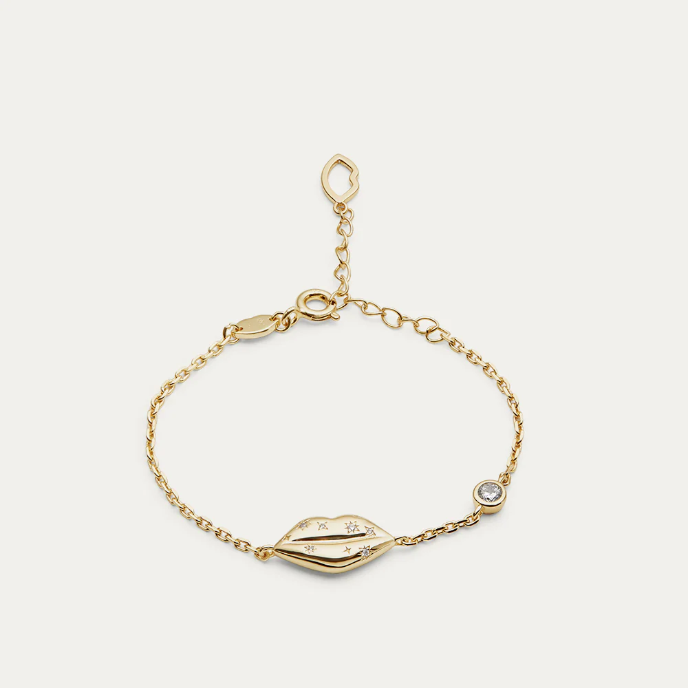 Delicate yet distinctive, the Cosmic Lip Pendant Bracelet features Lulu’s iconic lips reimagined in 14k gold plated sterling silver with constellation crystal details - a celestial accent for your wrist.