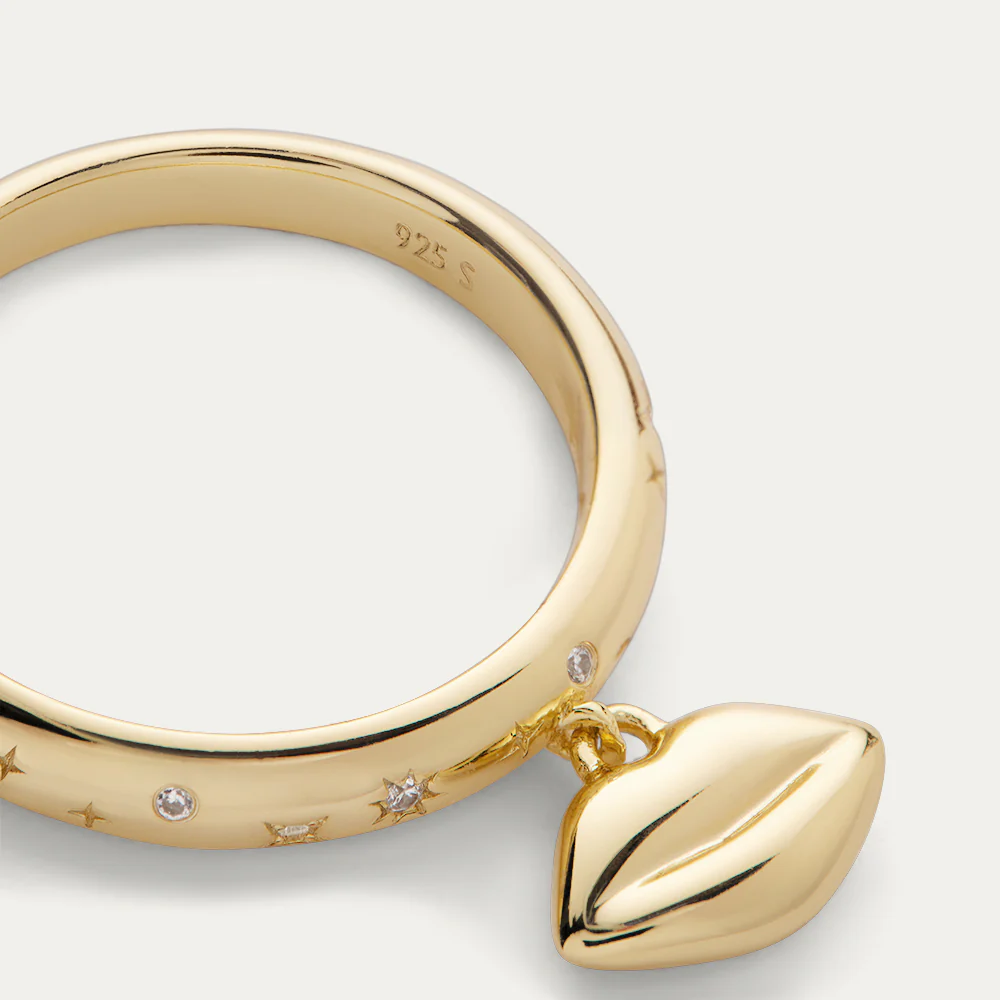 A cosmic twist on a classic, the Cosmic Lip Pendant Ring features shimmering crystals and a dangling 14k gold plated sterling silver lip charm for subtle movement and starry sparkle.