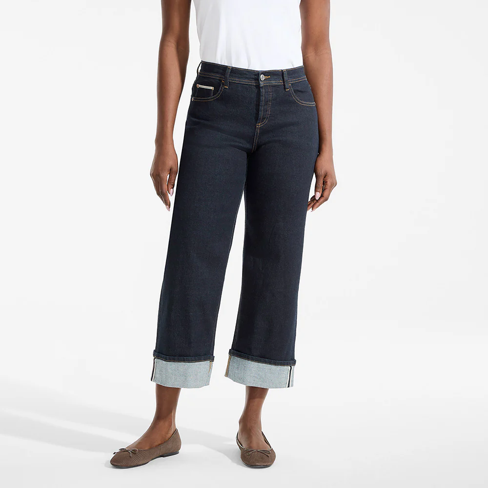 Part of our collaboration with Lands' End. These effortless wide leg jeans are a keeper. Finished with turn ups and a signature lip stitch on the back pockets, they add a playful flourish as you walk away - proof that even your staples deserve a little personality.