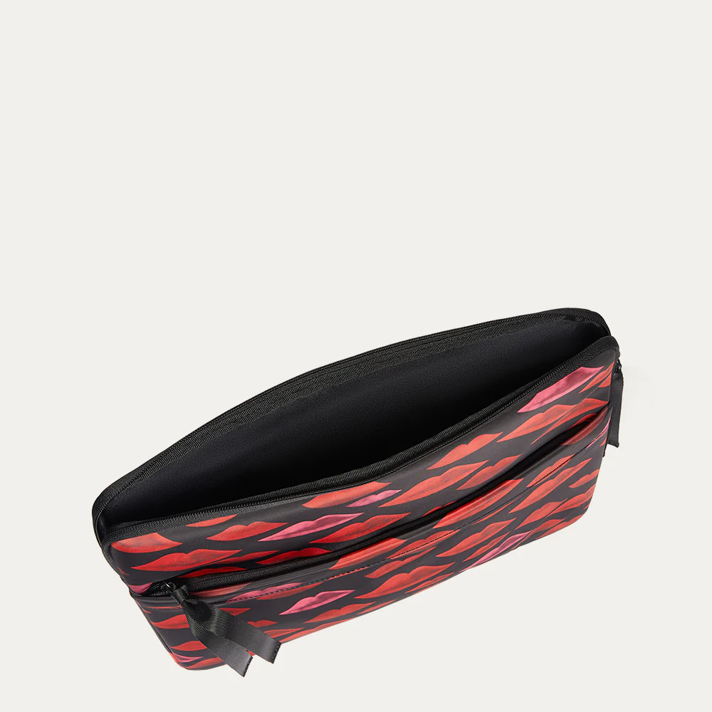 The Sunny Laptop Case combines recycled nylon with a vibrant watercolour lips print in red and pink. Featuring ribbon zip pulls, a slim silhouette, and soft lining for protection, it’s a stylish way to carry your tech anywhere.