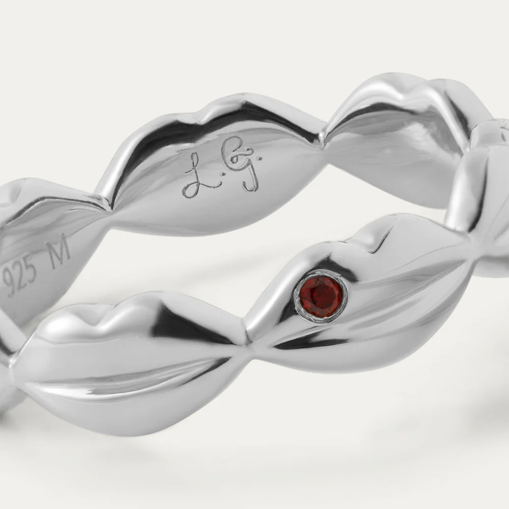 Featuring linked signature sterling silver lips, the Ruby adorned ring is your simple band with a Lulu difference! With 3D lips, this pretty ring will add a playful finish to all of your looks.
